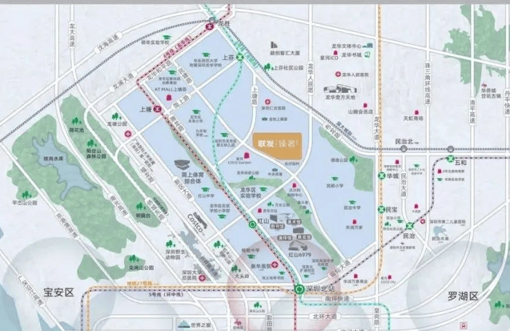 联发·臻著雅居占位的红山-上塘,是龙华核心资源最为集中板块之一,被誉为龙华的CLD,作为城市中轴中心片区,红山-上塘与福田、罗湖中心及西丽大学城、留仙洞总部基地等核心地带相邻。 这在人流、资金流等方面得以持续承接外溢需求,片区资源虹吸效应突出,是满足高品质商住的承载区。 同时,片区南面与深圳北站商务区接壤,相当于龙华的中央商务区;东北面为龙华传统中心,规划发展为龙华超级商圈。