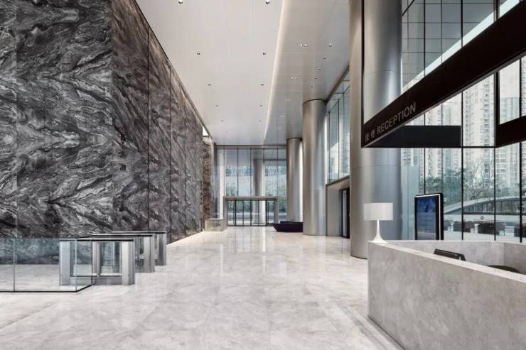 【大厦选材】作为博今国际商务广场办公楼的核心空间,设计追求简洁大气,国际化的永恒美感。同时,在用材上以棕色石材与质感金属搭配,摒弃多余的装饰