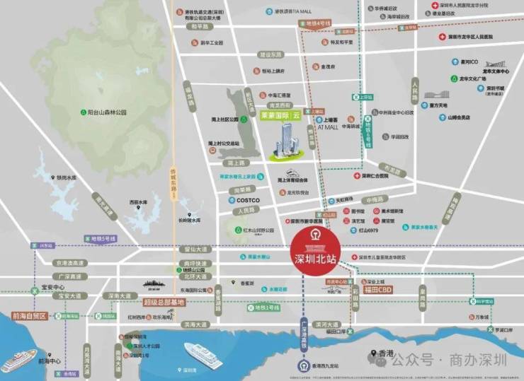 紧邻项目的龙华北站超核片区,位处深圳七大总部基地之一,商办密度比肩前海,集聚世界高层次人才,吸引诸多名企总部落户,打造“国际会客厅”。