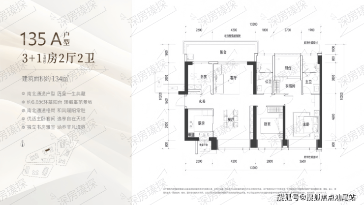 134㎡的4房2厅2卫,A户型(1栋1/2单元05户型),设计的是竖厅南北通透格局,进门入户玄关,客厅4.2米开间,LDKB一体化设计,四开间朝南,4个卧室分别做到了主卧19.44㎡/次卧10.64㎡/次卧10.26㎡/次卧7.8㎡(包含墙体飘窗),客厅连接次卧出6.8米长的观景大阳台看深大校区,U型厨房,卫生间干湿分离,得房率约90%(包含赠送),西北朝向。