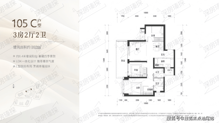102㎡的3房2厅2卫,C户型(1栋1/2单元02户型),设计的是竖厅格局,客厅3.6米开间,LDK一体化设计,3个卧室分别做到了主卧16.93㎡/次卧9.24㎡/次卧8.96㎡(包含墙体飘窗),客厅连接次卧出6.4米长的宽景大阳台,U型厨房,卫生间干湿分离,得房率约90%(包含赠送),西南或东北朝向。