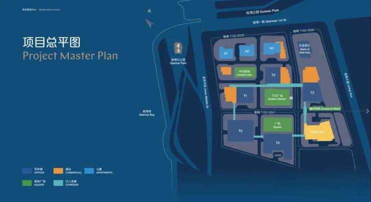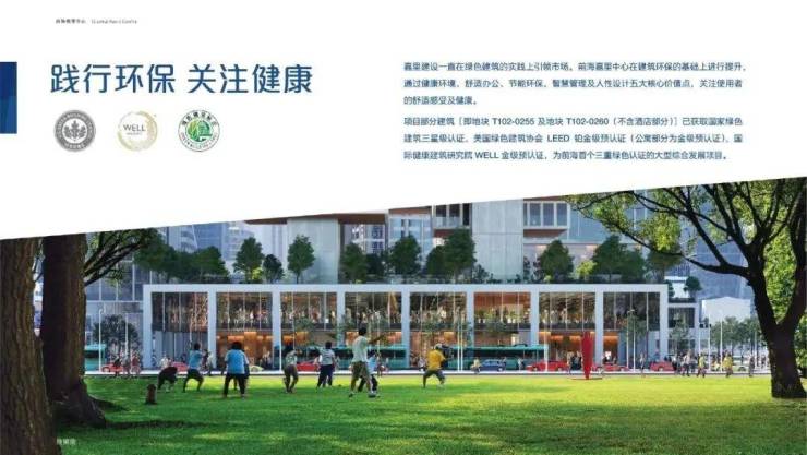 项目部分建筑【即地块T102-0255及地块T102-0260(不含酒店部分)已获取国家绿色建筑三星级认证、美国绿色建筑协会LEED铂金级预认证(公寓部分为金级预认证)、国际健康建筑研究院WELL金级预认证,为前海首个三重绿色认证的大型综合发展项目 。