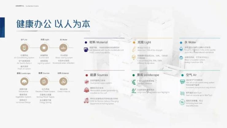 嘉里建设一直在绿色建筑的实践上引领市场。前海嘉里中心在建筑环保的基础上进行提升,通过健康环境、舒适办公、节能环保、智慧管理及人性设计五大核心价值点,关注使用者的舒适感受及健康。