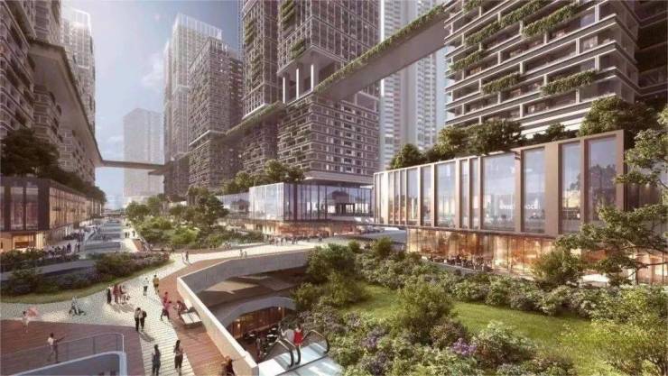 一条约1.1公里中央绿轴,贯穿南北,将商业、景观、人文艺术场所统统串联起来,包括约30万㎡架空层空中花园、约40万㎡商业、约6.6万㎡中央绿轴公园等。