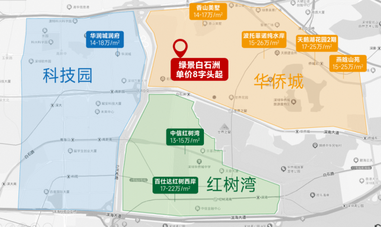 要提醒大家的是,8字头的底价是限时限量的,这只是总建面约500㎡的绿景白石洲呈现给深圳的开胃菜。作为深圳最大的旧改项目,体量是华润城大冲旧改的近两倍,占据南山腹心——深南大道总部经济轴与大沙河科技创新轴组成的“超级十字”交汇点,其他批次售价必然上调。