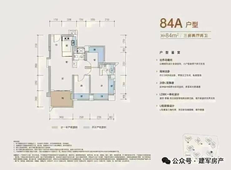 84㎡的3房2厅2卫,设计的是经典竖厅格局,进门入户玄关,客厅3.4米开间,LDKB一体化,S墙设计预留冰箱位,动静分区,分别做到了主卧13.5㎡/次卧8.75㎡/次卧8.6㎡(包含墙体飘窗),U型厨房,公卫三段式干湿分离,得房率约:77.2%(不含赠送),东北朝向。