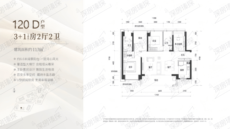 117㎡的4房2厅2卫,D户型(3栋2单元06户型),设计的是横厅南北通透格局,客餐厅6.6米开间,四开间朝南,4个卧室分别做到了主卧17.35㎡/次卧9.8㎡/次卧9.1㎡/次卧8.05㎡(包含墙体飘窗),客餐厅出6.6米长的宽景大阳台,U型厨房,公卫三段式分离,得房率约90%(包含赠送),西南朝向。