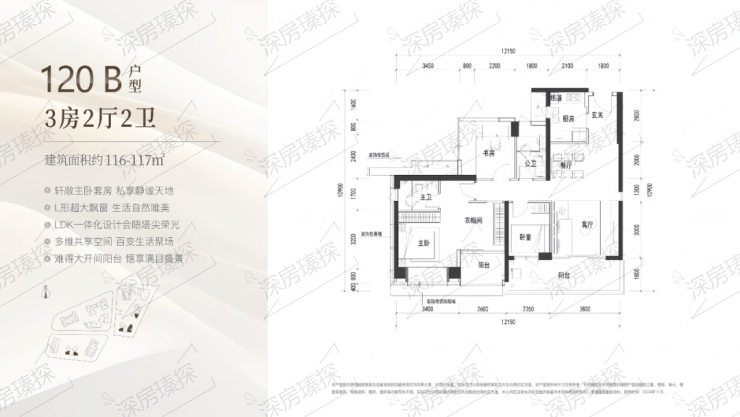117㎡的3房2厅2卫,B户型(2栋4单元01.02.05/3栋2单元02/05户型),设计的是经典竖厅格局,客厅3.8米开间,LDKB一体化设计,3个卧室分别做到了主卧28.6㎡/次卧9.6㎡/次卧7.05㎡(包含墙体飘窗),客厅连接次卧出6.15米长的宽景大阳台,U型厨房,卫生间干湿分离,得房率约90%(包含赠送),东南或正东朝向。其实也可以改4房。