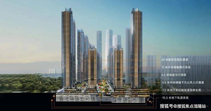 其次,项目打造了多维共享空间,把垂直城市的理念实践到一个新的高度!从地上24米到地下15.5米,6个垂直空间平面,依次规划了屋顶花园、中央绿轴慢行系统、地面车行道路、人行通道、地下停车场及联络道、以及轨道交通系统,无论你在哪一层,都有完善的通行指引。继续向上,50米处,千米空中连廊。