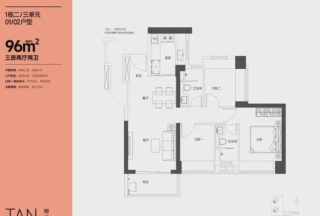 96㎡的3房2厅2卫,设计的是经典竖厅格局,LKDB一体化设计,进门入户玄关,动静分区,三开间朝南,有1个次卧做的双飘窗,U型厨房,得房率:74.34%(不含赠送),全部西南朝向。