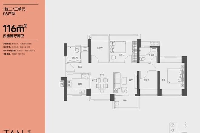 116㎡的4房2厅2卫,设计的是横厅南北通透格局,LKDB一体化设计,进门入户玄关,五开间朝南,超大宽面,主卧南北通设计,U型厨房,得房率:74.35%(不含赠送),阳台主朝东南向。