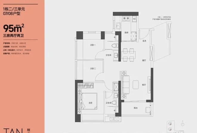95㎡的3房2厅2卫,设计的是竖厅格局,LKDB一体化设计,进门入户玄关,有1个次卧做的双飘窗,U型厨房,卫生间三段式分离,得房率:74.34%(不含赠送),全部东南朝向。