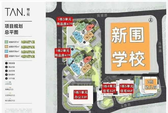 龙华【檀悦府】总占地面积约1.6万㎡,总建筑面积约19万㎡,计容建筑面积约14.1万㎡,容积率8.82,绿化率40.12%,共由4栋32-47层高住宅+1栋33层办公组成,其中1栋1单元办公33F,1栋2/3单元商品房47F,1栋4单元住宅32F,1栋5单元住宅46F,2栋配建1所6班制幼儿园。