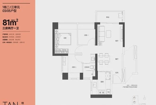 81㎡的3房2厅1卫,设计的是竖厅格局,LKDB一体化设计,进门入户玄关,有1个次卧做的双飘窗,U型厨房,卫生间三段式分离,得房率:74.34%(不含赠送),全部西北朝向。