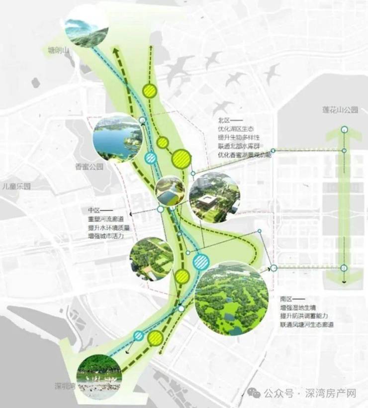 规划打造香蜜湖水廊,一直通向深圳湾,沿水廊建成城市公园、绿道和城市慢行道,高尔夫球场西侧约1/3的面积也纳入规划,将建成体育公园。