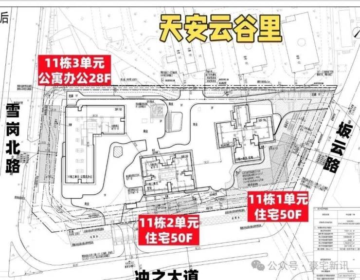 天安云谷里01-05地块,总占地面积约1.5万㎡,总建筑面积约16.5万㎡,计容建筑面积约11.1万㎡,容积率7.24,绿化率40%,共由2栋总高50层住宅组成,另外配建1栋28层公寓办公,其中11栋1/2单元住宅50F,配建约1.6万㎡商业。