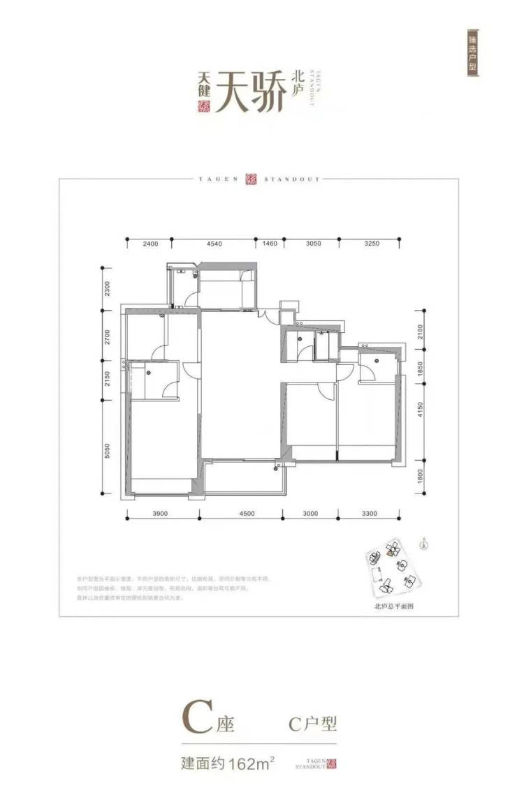 1栋C座:141.7米 44层,共205户,朝南为主,四梯五户,121-162平