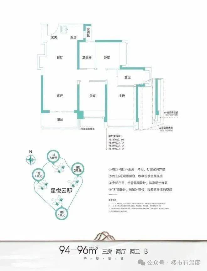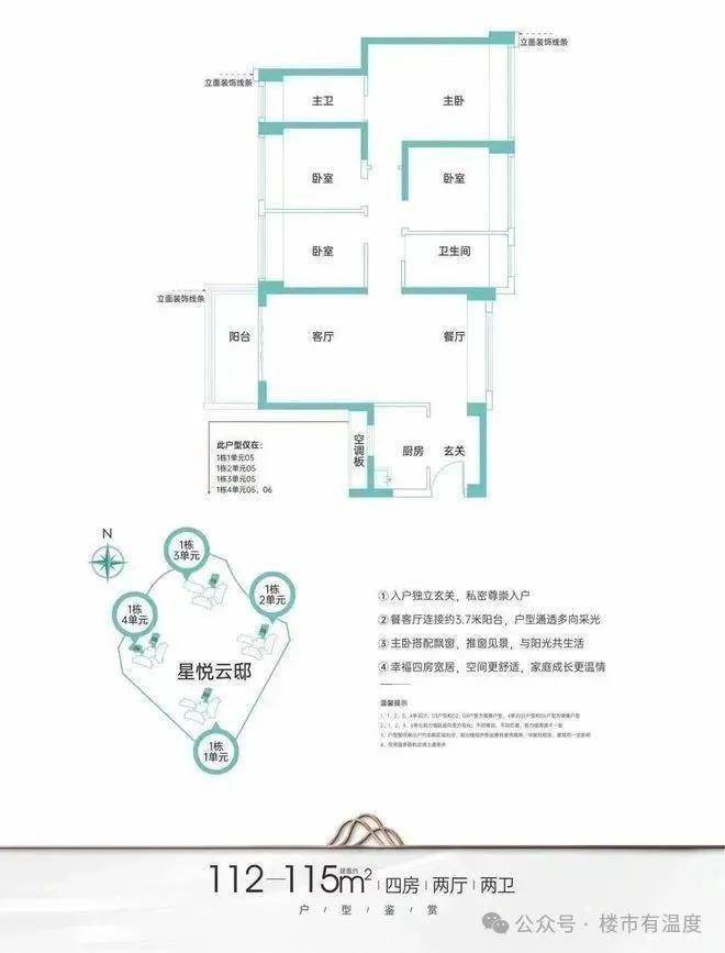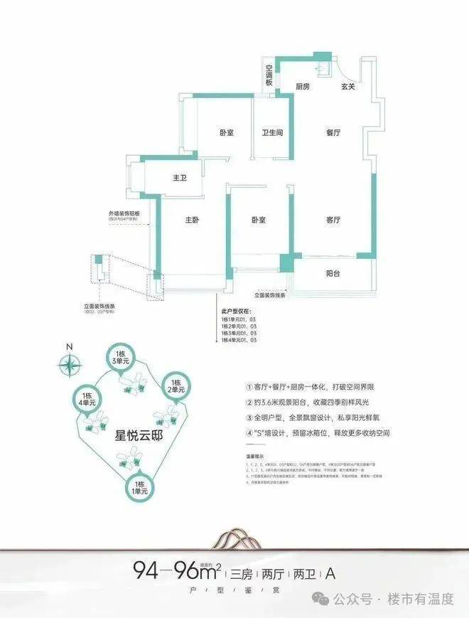 项目共规划有1007套住宅,主推户型为建面约95-125㎡3-4房。