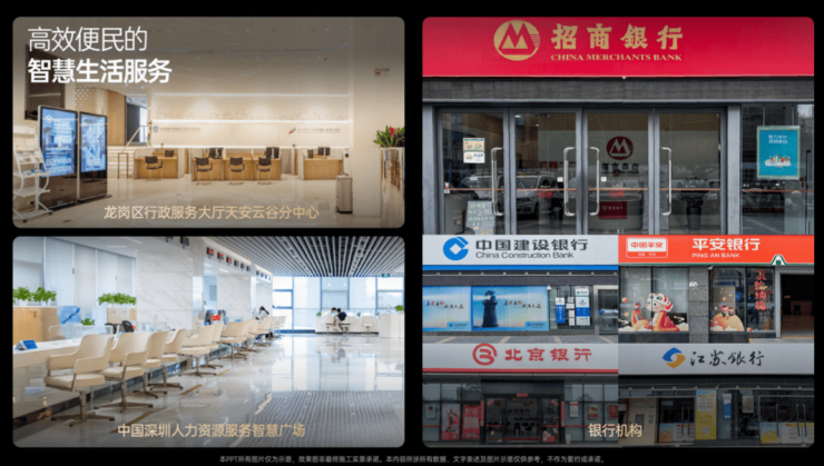 便民政务:园区内设龙岗区行政服务大厅天安云谷分中心、深圳人力资源服务智慧广场,入驻了招商银行、平安银行、建设银行等十几家银行机构,可直接办理社保业务、公积金业务、理财对公等政务商务需求。