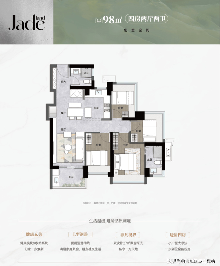 - 98-114㎡ 4房2卫:主打灵活空间设计,如98㎡户型可调整为两房至四房,114㎡采用横厅布局,南北通透,阳台保留一期大尺寸设计。