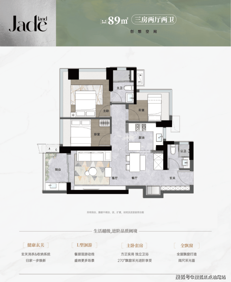 - 89㎡ 3房2卫:采用L型洄游厅设计,餐厨动线优化,并配置豪宅级餐边柜,270°全景飘窗提升采光,新增独立健康玄关模块。