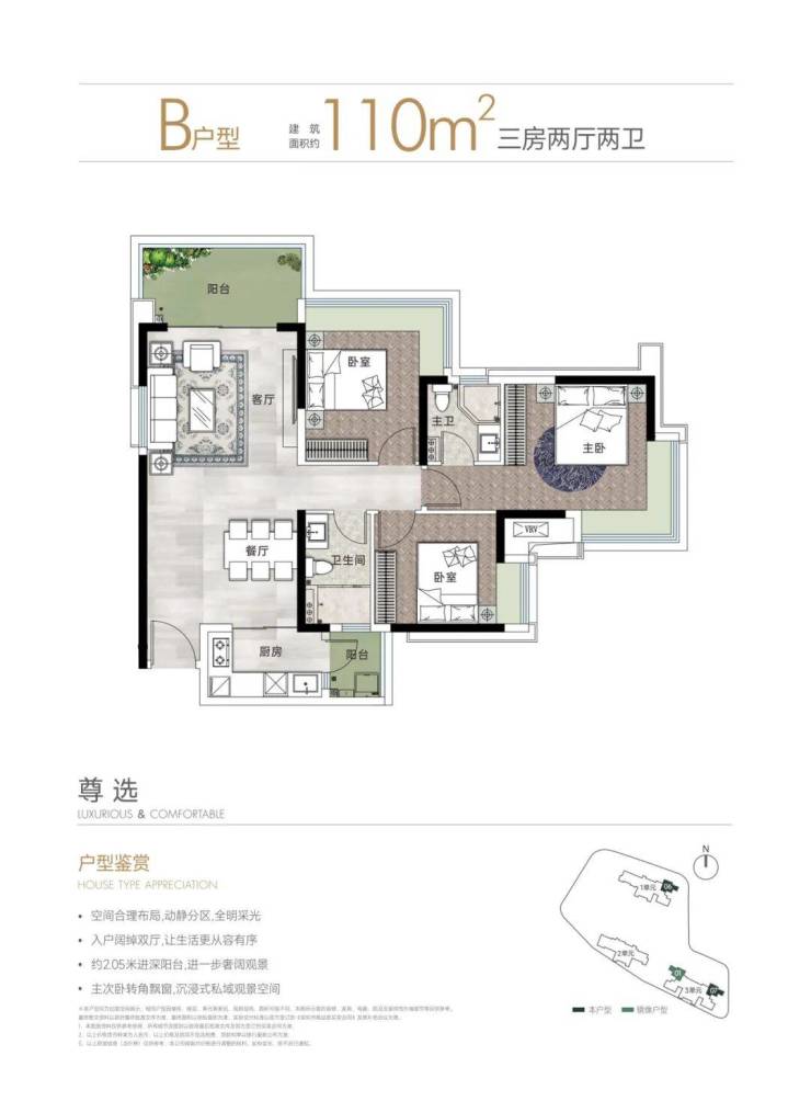 主力户型为建面约90/110㎡的A/B户型,全系采用全尺寸飘窗/转角飘窗和大阳台配置,充分发挥景观优势。