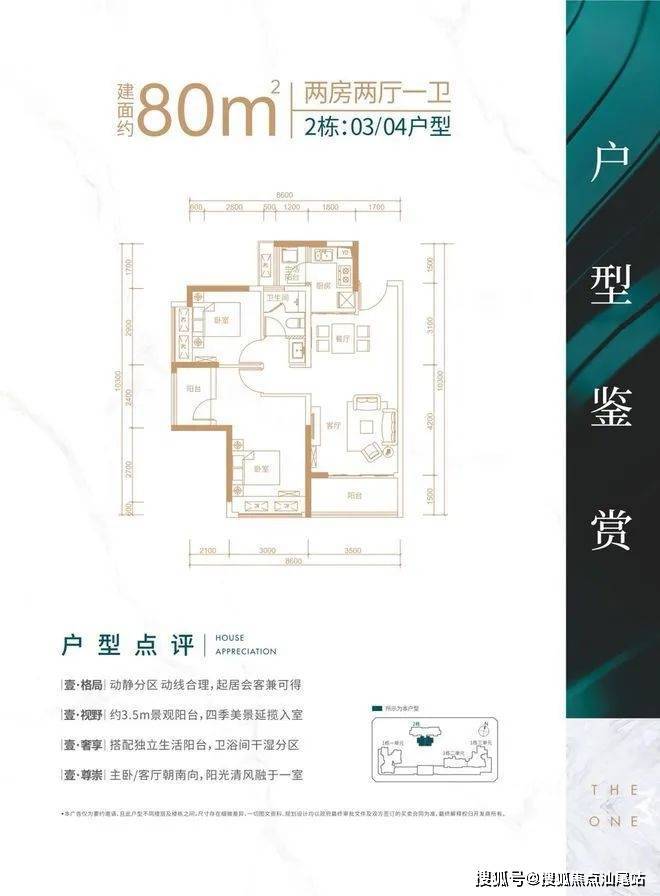 80㎡3房2厅1卫(单价7万-7.6万-总价570-610万)客厅朝南带阳台,主卧朝南,次卧朝西该户型分布在2栋03,04号房