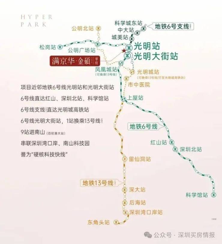 满京华金硕悦府,是新规楼盘100%得房率,科学公园+光明湖景观,且做到了户户朝南或南北通透格局,6号地铁线光明站距离仅400米。