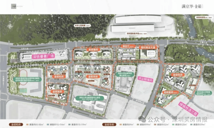 最值得一提的是满京华金硕臻府西侧约200米规划有1所深圳外国语楼村第四学校,已经对外官宣,深圳四大名校之一,计划是在2025年首次招生,该校也是在学区范围内,是1所九年制公办学校,规划45个班,有2100个学位。