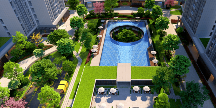 前瞻设计,生态光苑与泳池联通互动