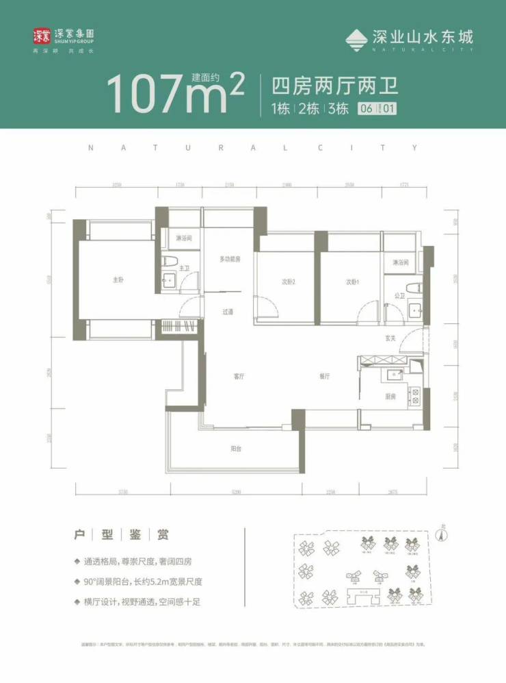 设计的是横厅南北通透格局,客餐厅一体化,4个卧室分别做到了3.25米/2.55米/2.4米/2.15米的宽度,主卧南北通透,长5.2米的L型大阳台,U型厨房,卫生间干湿分离,得房率:79.96%(不含赠送),阳台主朝西南或东南向。