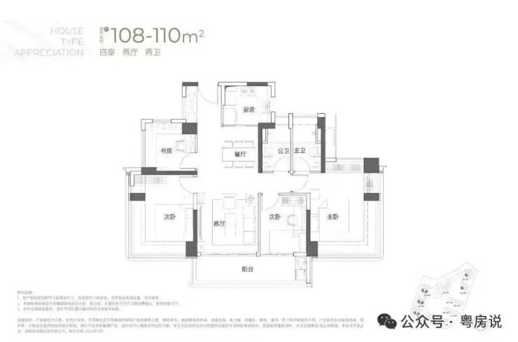 108-110㎡的4房2厅2卫:竖厅双龙抱珠格局,客厅开间3.5米,LDKB一体化,4个卧室分别做到了3.7米/3.4米/2.8米/2.6米的宽度,主卧加2个次卧270°全景飘窗,客厅连接次卧出6.1米长的大阳台,U型厨房,得房率约95-97%(包含赠送),西南或东南朝向。户型分布在1栋1/2/3单元03/04户型,03户型东南朝向,04户型西南朝向;只有2栋2/3单元看小区,其他都看向小区外部;