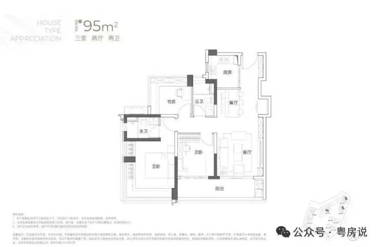 95㎡的3房2厅2卫:传统竖厅格局,客厅开间3.5米,LDKB一体化,S墙设计预留冰箱卡槽位,3个卧室分别做到了3.6米/2.8米/2.8米的宽度,主卧加1个次卧270°全景飘窗,客厅连接次卧出6.3米长的大阳台,U型厨房,得房率约95-97%(包含赠送),西南或东北朝向。户型分布在2栋2/3单元04/05户型,东北朝向看大南山、2栋1单元04/05户型西南朝向看小区;