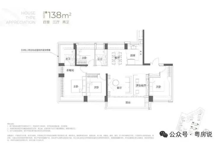 138㎡的4房2厅2卫:竖厅南北通透格局,专梯入户,客厅6.1米开间,LDKB一体化,全屋飘窗,4个卧室分别做到了3.9米/3.25米/2.9米/2.8米的宽度,主卧加1个次卧270°全景飘窗,客厅出6.1米长的大阳台,U型厨房,得房率约95-97%(包含赠送),阳台主朝西南向。138平米户型分布在3栋1单元、3栋2单元、4栋1单元、4栋2单,4个单元纯大户型。