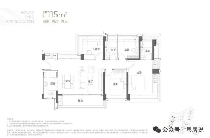 115㎡的4房2厅2卫:横厅南北通透格局,客餐厅6米开间,LDKB一体化,全屋飘窗,4个卧室分别做到了3.9米/3米/2.8米/2.6米的宽度,主卧加1个次卧270°全景飘窗,客厅出6米长的大阳台,L型厨房,得房率约95-97%(包含赠送),西南或东南朝向。115平米户型分布在1栋1单元、1栋2单元、1栋3单元01/02户型,01户型西南朝向都是看小区外围,02户型看向小区;
