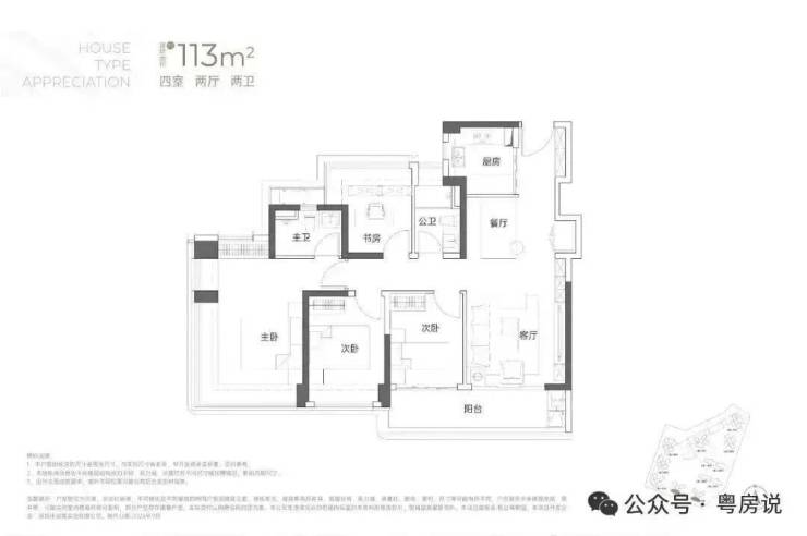 建面113平米:4房2厅2卫,传统的竖厅户型动静分区,‘S’型墙体,有冰箱预留位;市面非常常见的竖厅4房户型,比较突出的是有大阳台连接客厅和次卧;主卧和书房(卧室)都是多飘窗设计,保证了视野和多方面的采光;这种户型的缺点是走廊过长,空间利用率比横厅或者双龙抱珠户型差些;户型分布在5栋、6栋03/04户型,均是西南朝向,看小区外面大南山方向,比较安静;