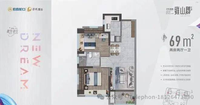 69㎡的2房2厅1卫设计的是竖厅格局,客餐厅一体化,L型厨房,得房率:70.9%(不含赠送),阳台西南朝向。