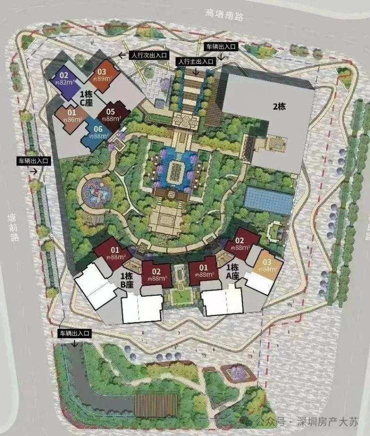 楼栋:南区3栋住宅+1栋公寓,北区9栋高层住宅(已封顶)户型面积84平 3房1卫 310万89平 3房2卫 340万得房率(含赠):梯户比 :A和B栋2梯6户(33层);C栋2梯5户(32层))总户数:2126户车位数:2222个车位比:超1比1