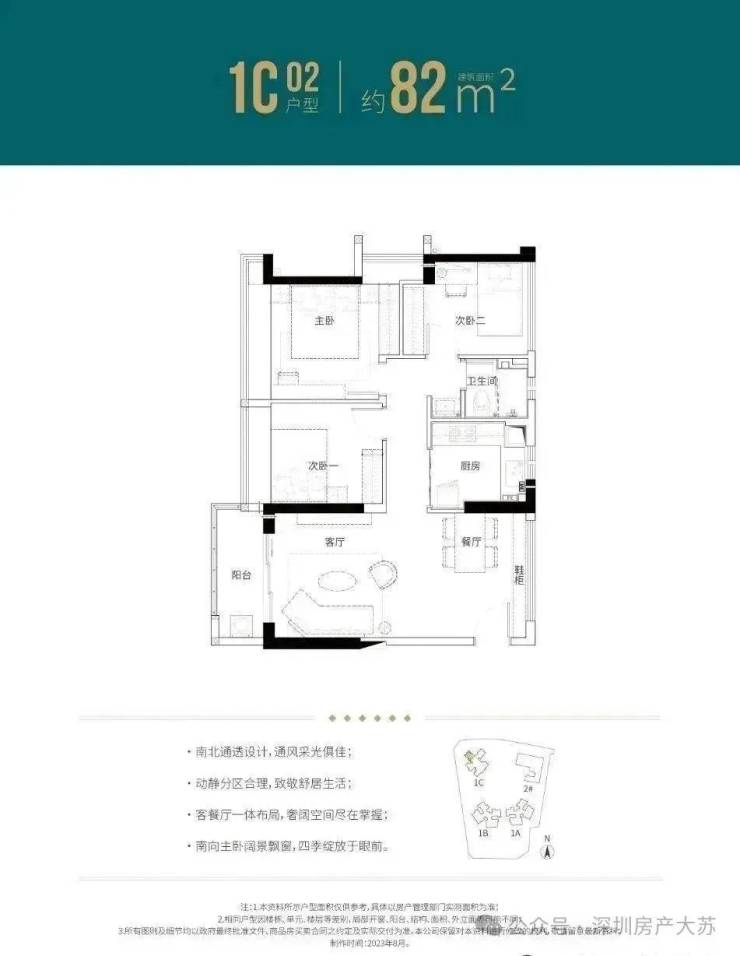 82㎡的3房2厅1卫(1栋C座01户型),设计的是竖厅南北通透格局,客厅3.6米开间,三开间朝南,动静分区,L型厨房,得房率:77.27%(不含赠送),阳台西南朝向。