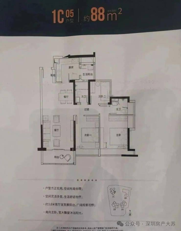 88㎡的3房2厅2卫(1栋C座05户型),设计的是竖厅格局,客厅3.8米开间,动静分区,三开间朝南,主卧大套间设计,L型厨房,还带1个生活阳台,得房率:77.27%(不含赠送),阳台东南朝向。