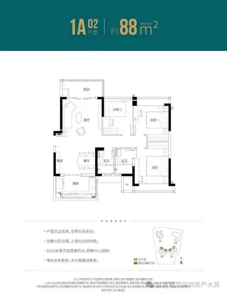88㎡的3房2厅2卫(1栋A/B座01.02户型),设计的是竖厅南北通透格局,客厅3.8米开间,动静分区,主卧大套间设计,U型厨房,得房率:79.61%(不含赠送),阳台主朝西北向。