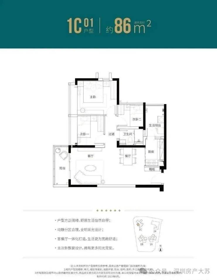 86㎡的3房2厅1卫(1栋C座01户型),设计的是竖厅格局,客厅3.6米开间,动静分区,三开间朝南,L型厨房,还带1个生活阳台,得房率:77.27%(不含赠送),阳台西南朝向。