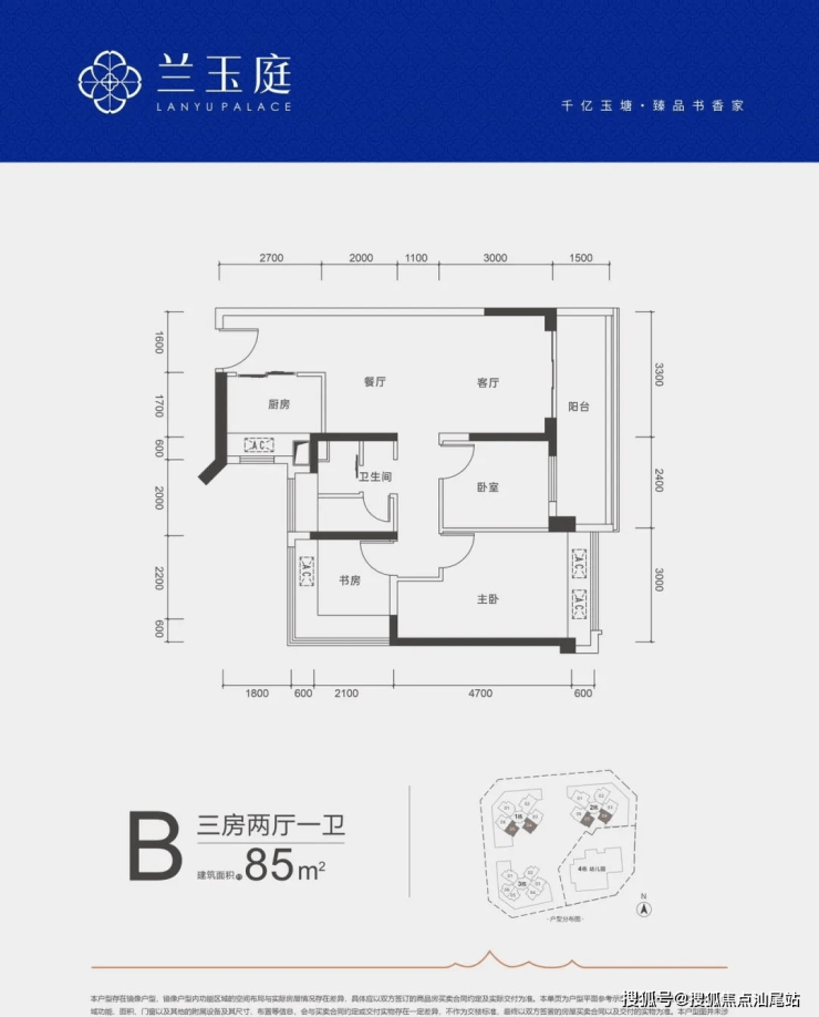 85㎡的3房2厅1卫,B户型,设计的是竖厅格局,客厅开间3.3米,LDKB一体化,三开间朝南,3个卧室分别做到了3米/2.7米/2.4米的宽度,客厅连接次卧出5.7米长的大阳台,L型厨房,创新式三分离卫生间,得房率约79%(不含赠送),西南或东南朝向。