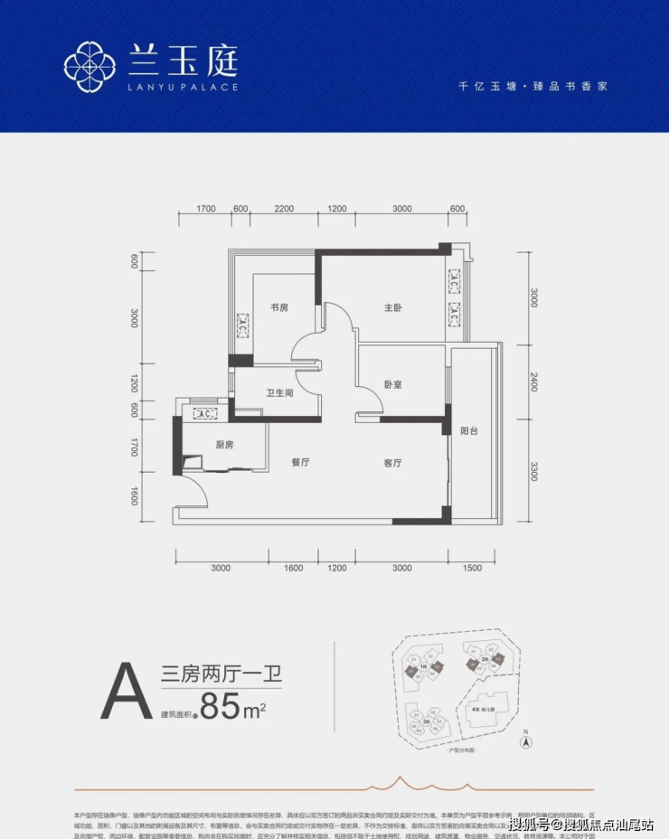85㎡的3房2厅1卫,A户型,设计的是竖厅格局,客厅开间3.3米,LDKB一体化,三开间朝南,3个卧室分别做到了3米/2.8米/2.4米的宽度,客厅连接次卧出5.7米长的大阳台,L型厨房,得房率约79%(不含赠送),西南或东南朝向。