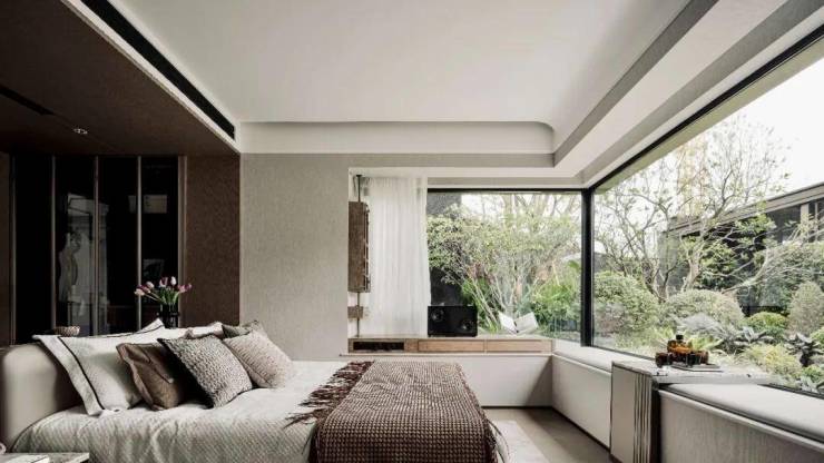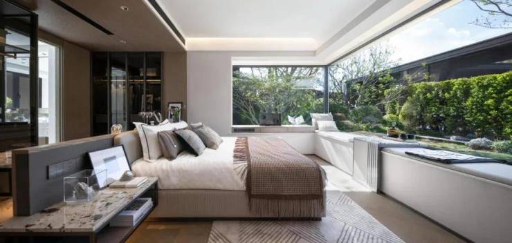 近40㎡的高定行政套房主卧空间内,自带独立卫浴室、大浴缸、双台盆,及超尺衣帽间,北面精心预留了一方空间,可随主人意志打造为书房或茶室,在此自成一方尊享天地,南向270°转角飘窗设计,让塔尖峯景成为了主人的窗前私享。