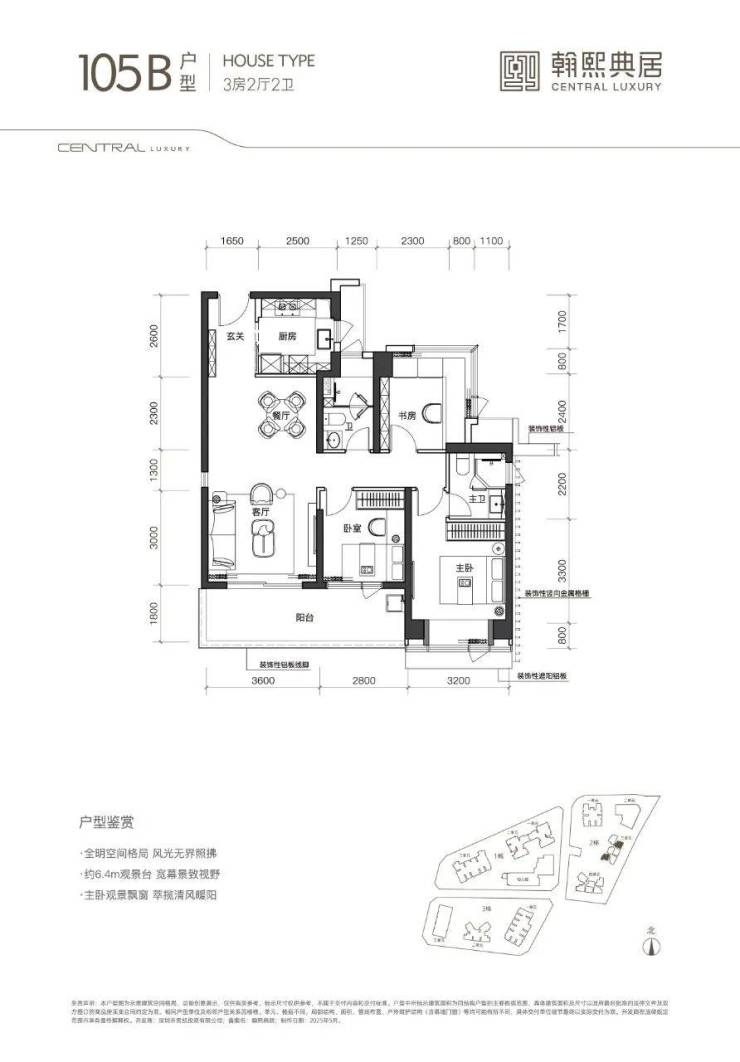 105㎡的3房2厅2卫,B户型(2栋3单元02/06户型),设计的是经典竖厅格局,客厅3.6米开间,LDKB一体化设计,三开间朝南,动静分区,3个卧室分别做到了主卧13.12㎡/次卧9.9㎡/次卧8.4㎡(包含墙体飘窗),客厅连接次卧出6.4米长的宽景大阳台,U型厨房,卫生间干湿分离,得房率约90%(包含赠送),正南或东南朝向。