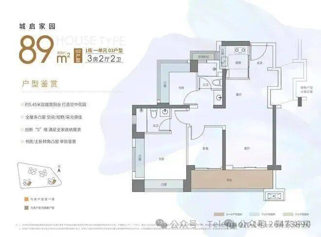 东南或西南朝向,竖厅设计,客厅有预留冰箱位,客厅,主卧,次卧分别朝南,户型一共有8个飘窗,加上阳台和飘窗使用率在90%左右。