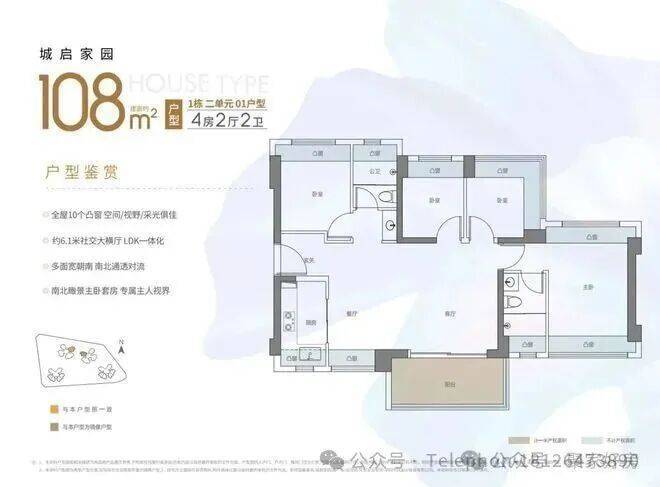 108㎡的4房2厅2卫,西南或东南向,横厅南北通透格局,进门独立玄关,客餐厅6.1米开间,主卧双飘窗通透设计,全屋10个凸窗,飘窗+阳台使用率在90%左右。