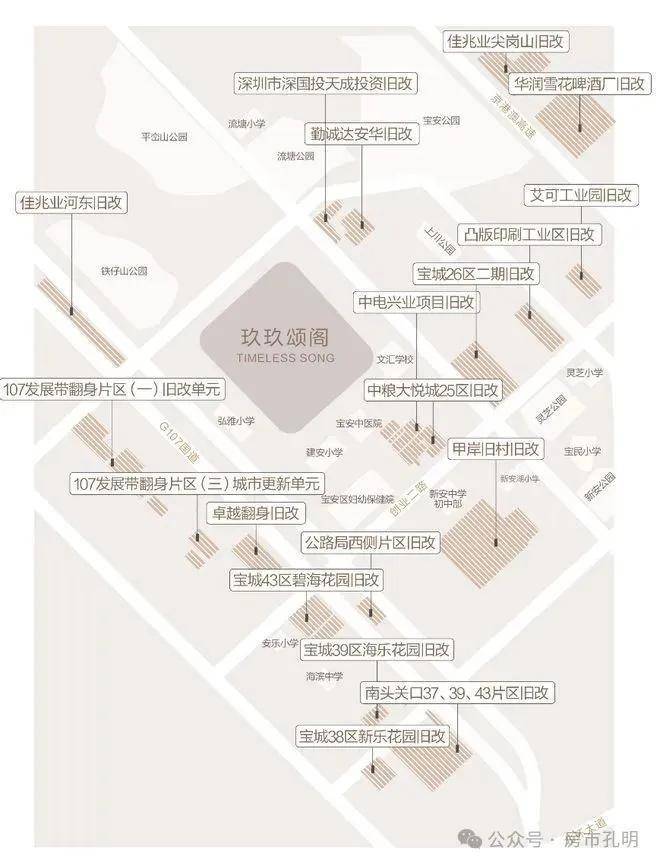 新安片区,尤其是在沿前进路正在进行着大规模的城市更新,分布着共20个旧改项目,超千万的旧改体量,相当于新安整个片区重建。仅我们项目2公里范围内就汇聚了8个旧改项目,分别是沃尔玛购物广场片区旧改、安华工业东区旧改,卓越翻身旧改、宝城碧海花园旧改、公路局西侧旧改、甲岸村旧改、宏发新领域、中洲中央公园二期。