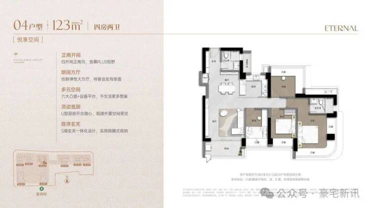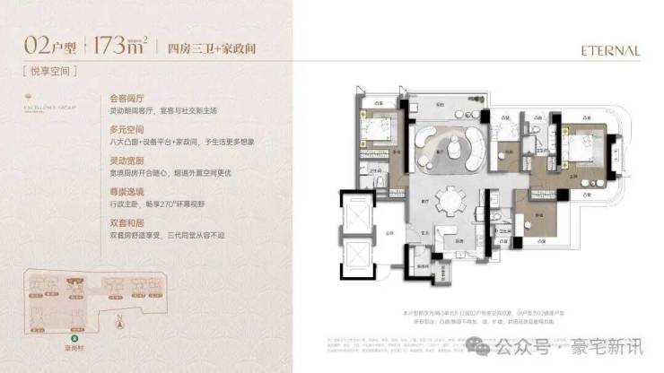 采用双龙抱珠格局,灵活适配成长型家庭。LDKB一体式布局,配备270°环幕主卧套房、U型厨房及七大飘窗,空间动静分离,实用且可变。